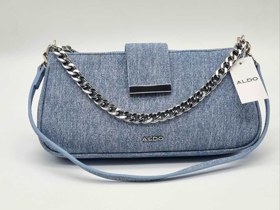 BOLSO SHOULDER BAGUETTE ALDO CON CADENA Y BROCHE, ORIGINAL, COLOR AZUL MEZCLILLA