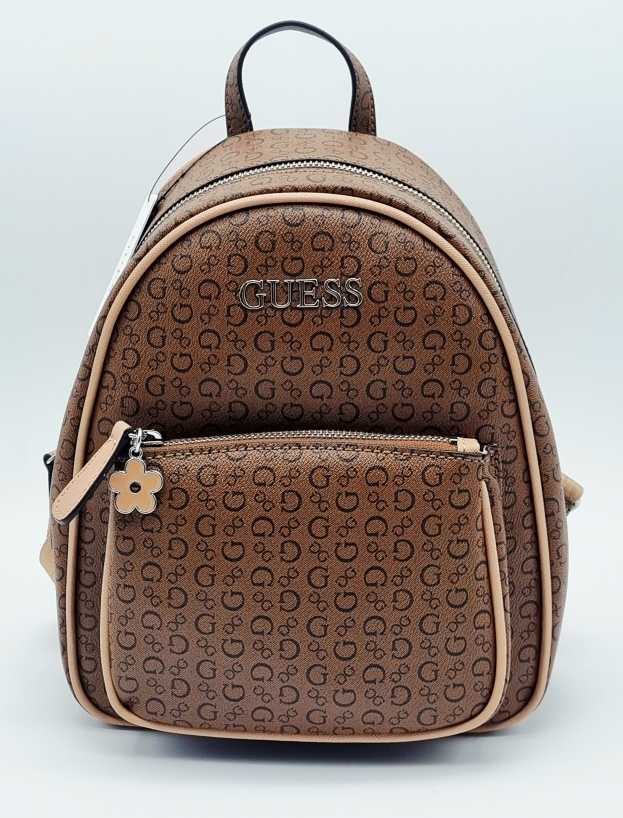 MOCHILA DOBLE COMPARTIMENTO GUESS CON COLGANTE DE FLOR, ORIGINAL, COLOR CAFÉ
