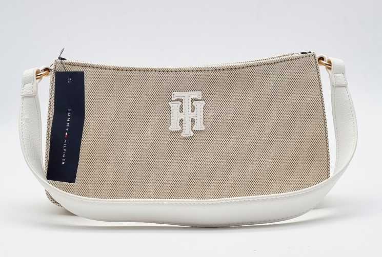 BOLSO BAGUETTE DE LONA TOMMY HILFIGER, ORIGINAL, COLOR BEIGE CON BLANCO