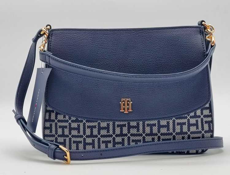 BOLSO CROSSBODY SADDLE MEDIANO TOMMY HILFIGER JACQUARD, ORIGINAL, COLOR AZUL MARINO