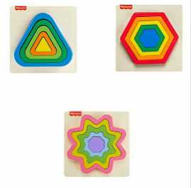 MINI ROMPECABEZAS ARCOÍRIS DE MADERA EN FORMA DE TRIÁNGULO, HEXÁGONO O ESTRELLA, FISHER-PRICE 2+