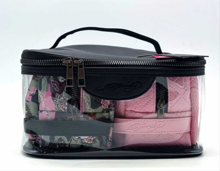 COSMETIQUERA NECESER HORIZONTAL ED HARDY CON 3 PIEZAS NEGRO CON ROSA, ORIGINAL