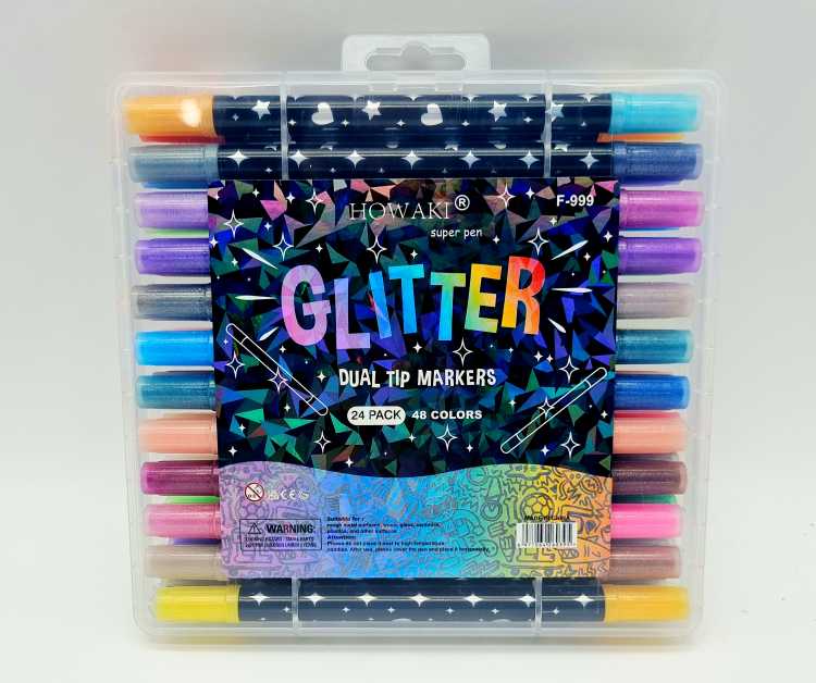 PLUMINES DOBLE PUNTA CON GLITTER HOWAKI, 24 PIEZAS, 48 COLORES