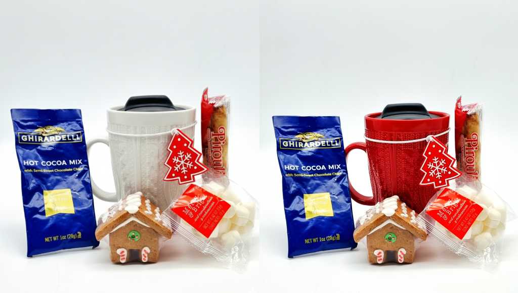 TAZA NAVIDEÑA RELIEVE DE SUÉTER CON CHOCOLATE, BOMBONES Y CASITA DE JENGIBRE, BLANCO O ROJO
