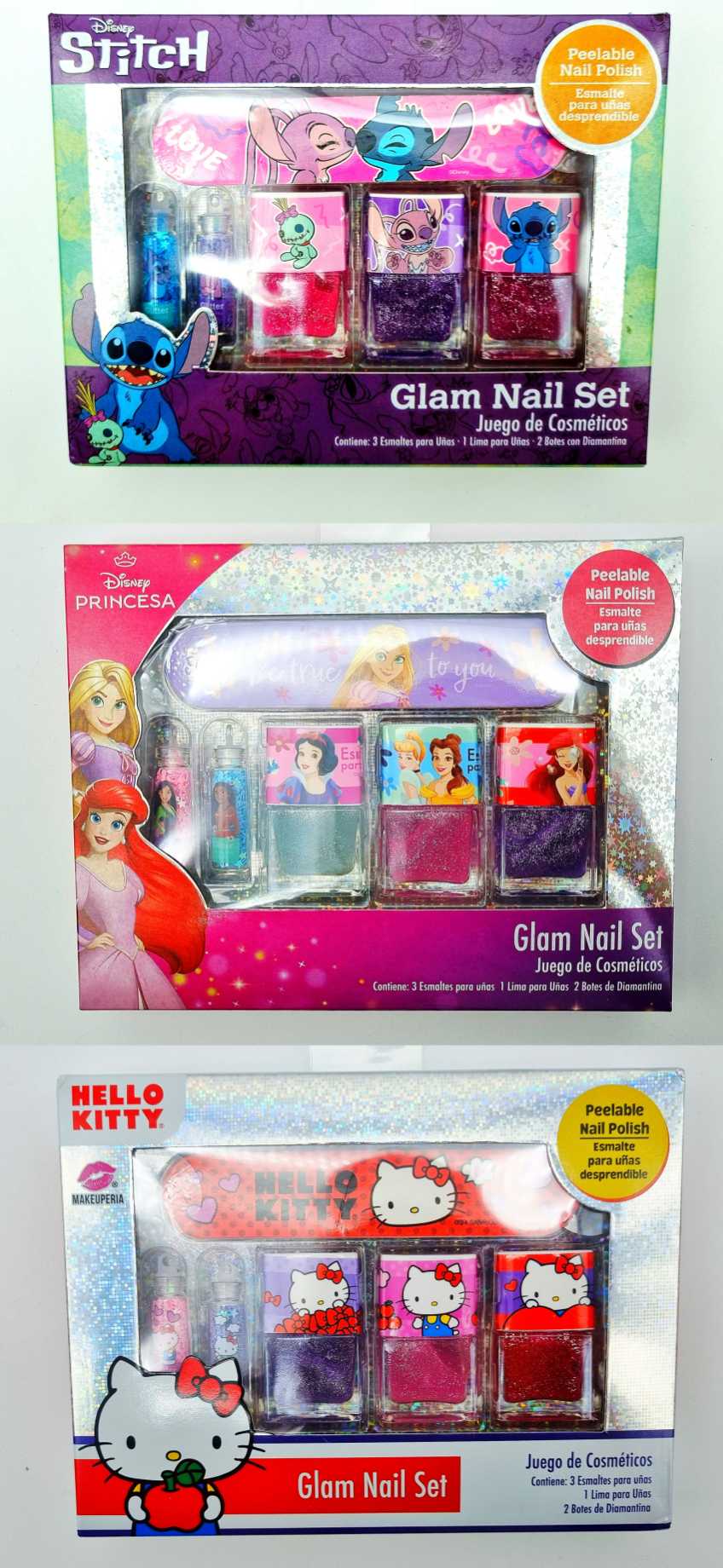 SET DE MANICURA CON ESMALTES, GLITTER Y LIMA, GLAM NAIL SET STITCH, HELLO KITTY Y PRINCESAS